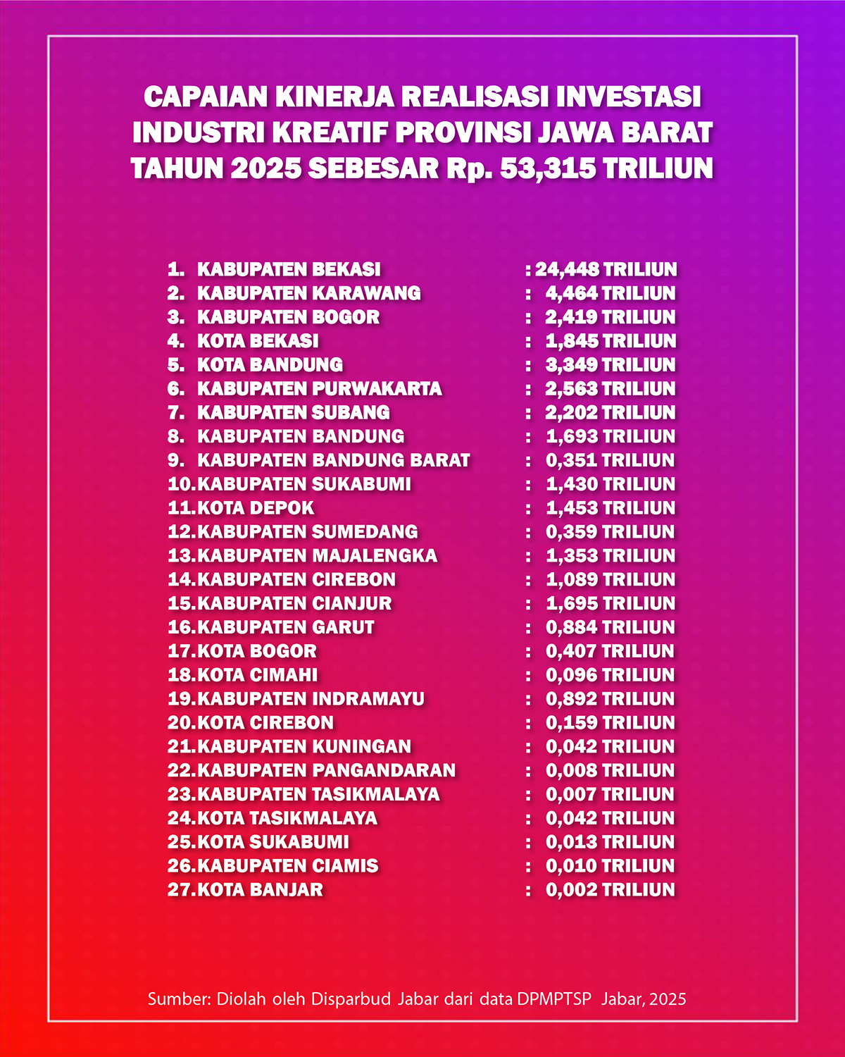 Berdasarkan data yang diolah oleh Dinas Pariwisata dan Kebudayaan Provinsi Jawa Barat (Disparbud Jabar) dimana sumber datanya berasal dari DPMPTSP (Dinas Penanaman Modal dan Pelayanan Terpadu Satu Pintu) Provinsi Jawa Barat tahun 20205, kinerja industri kreatif Jawa Barat sepanjang 2025 patut diapresiasi. Realisasi investasi mencapai Rp53,3 triliun, melampaui target yang ditetapkan. Angka ini bukan sekadar statistik karena ia menegaskan bahwa ekonomi kreatif telah menjadi salah satu motor pertumbuhan baru di tingkat daerah. Namun, seperti banyak cerita sukses lainnya, capaian ini menyimpan pertanyaan yang lebih mendasar: siapa yang benar-benar tumbuh di balik angka tersebut?