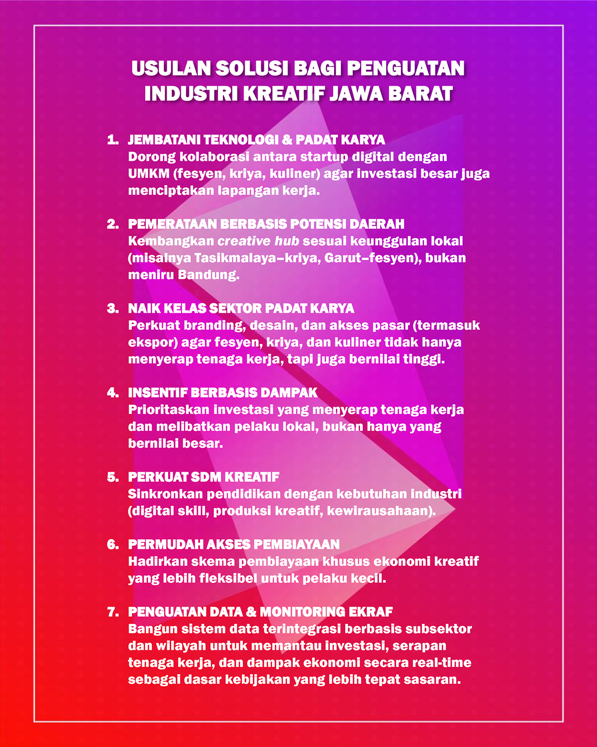 Ketiga, subsektor padat karya perlu didorong untuk naik kelas. Selama ini, fesyen, kriya, dan kuliner terbukti menjadi tulang punggung penyerapan tenaga kerja. Namun tanpa intervensi pada aspek desain, branding, dan akses pasar, sektor ini akan terus berada pada posisi nilai tambah yang rendah. Mendorong mereka masuk ke rantai nilai yang lebih tinggi termasuk pasar ekspor adalah langkah yang tidak bisa ditunda.