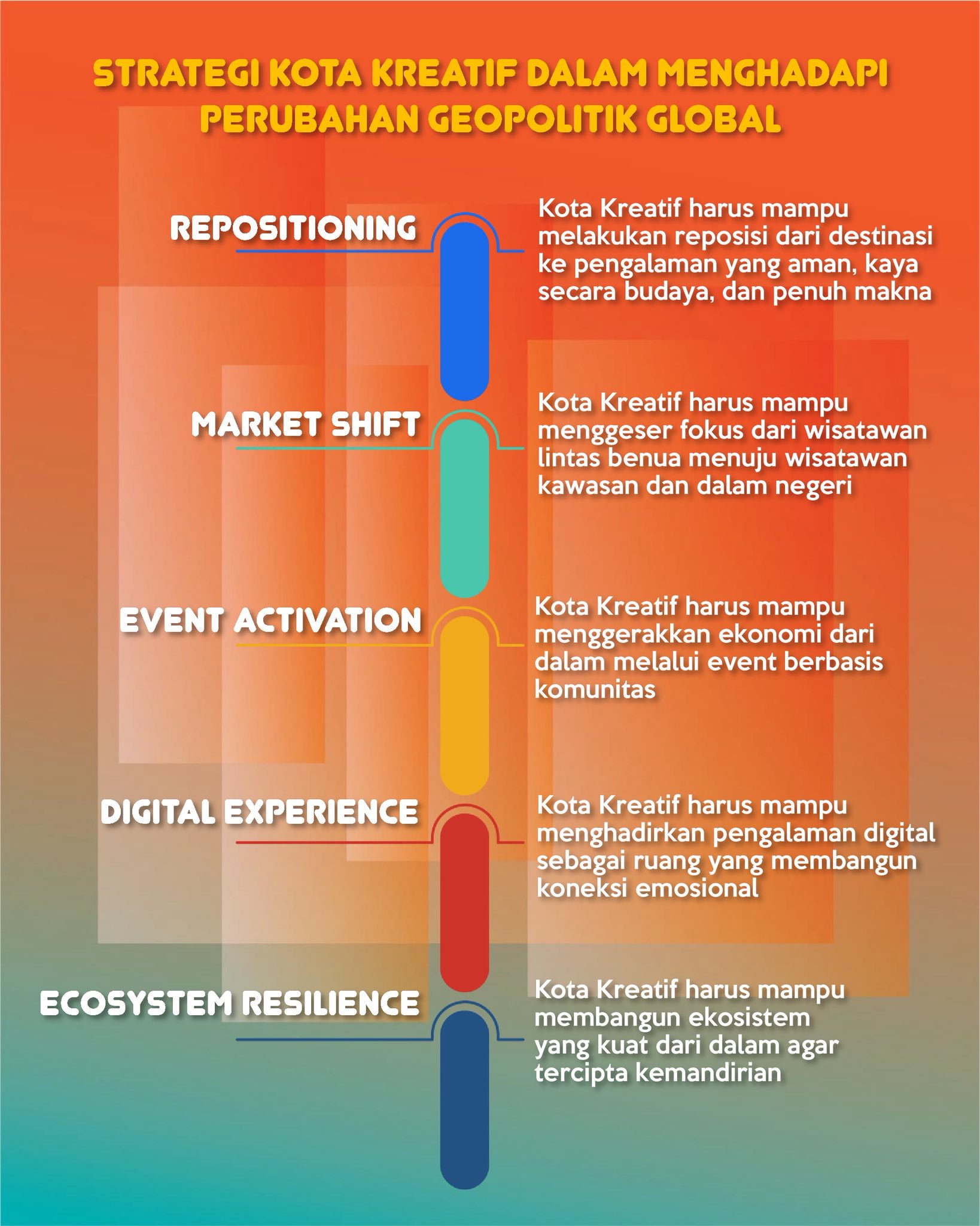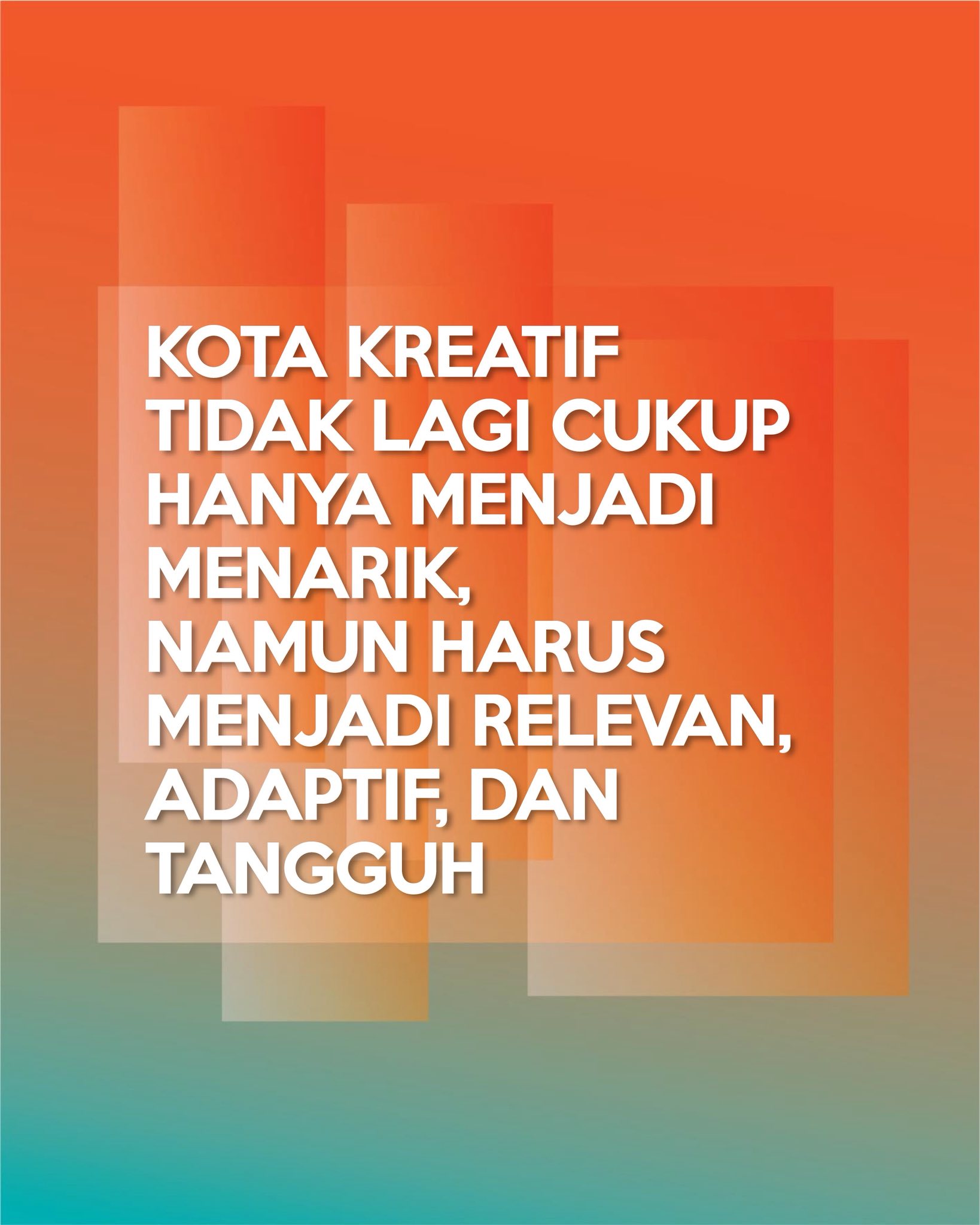 Dalam konteks Kota Kreatif, perubahan geopolitik global juga telah menggeser cara dunia bergerak. Dalam situasi yang penuh ketidakpastian, kota kreatif tidak lagi cukup hanya menjadi menarik, namun ia harus menjadi relevan, adaptif & tangguh. Karena itu, arah baru kota kreatif di Indonesia tidak bisa lagi bersifat normatif, tapi konkret, terukur & berakar pada realitas baru dunia.