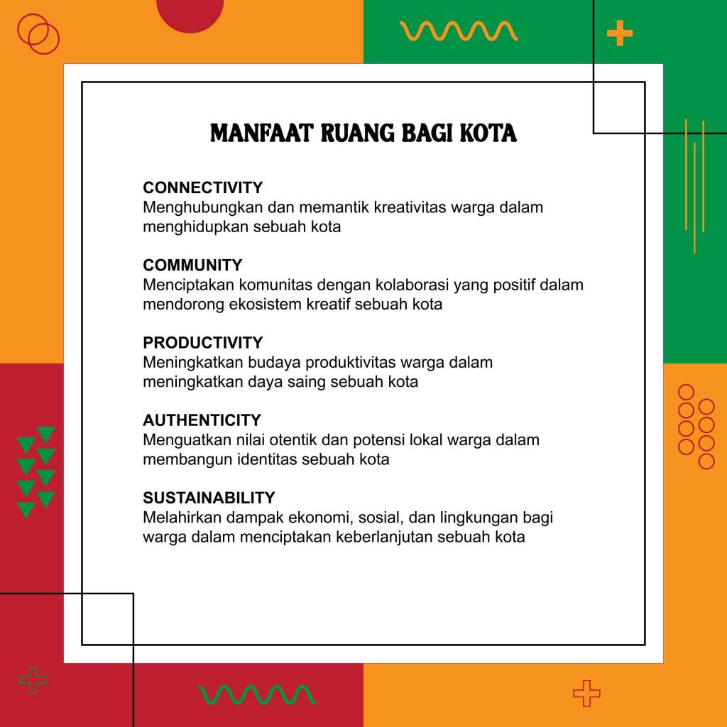 Sebuah ruang yang memanfaatkan kreativitas akan membuat warga sebuah kota dapat melihat potensi serta peluang untuk meningkatkan kualitas hidup.