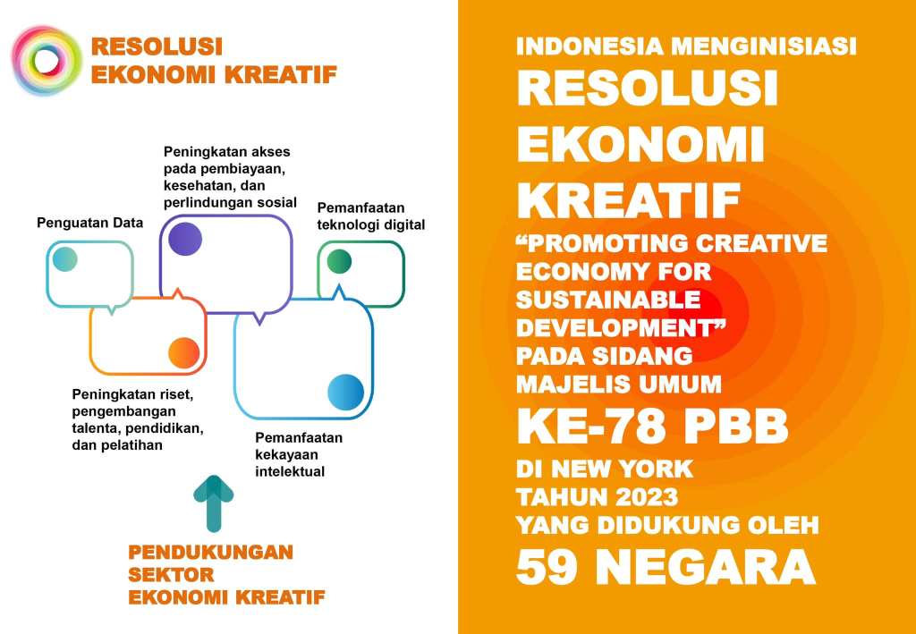 Pada tanggal 19 Desember 2023, Indonesia berhasil menginisiasi diadopsinya Resolusi Ekonomi Kreatif yang berjudul “Promoting Creative Economy for Sustainable Development” pada Sidang Majelis Umum ke-78 PBB di New York. Resolusi yang didukung oleh 59 negara ini merupakan Resolusi substansi PBB yang disahkan untuk pertama kalinya dimana secara khusus membahas Ekonomi kreatif.