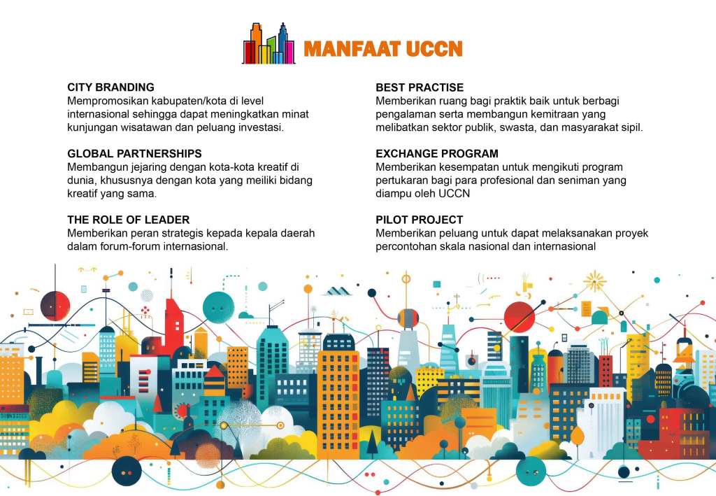 Saat ini di Indonesia telah ada 5 Kota yang berhasil masuk ke dalam jejaring kota kreatif UNESCO (UCCN) yakni Kota Pekalongan sebagai “City of Craft & Folkarts” (2014) ; Kota Bandung sebagai “City of Design” (2015) ; Kota Ambon sebagai “City of Music” (2019) ; Kota Jakarta sebagai City of Literature (2021) ; dan Kota Surakarta sebagai City of Craft & Folkarts (2023).