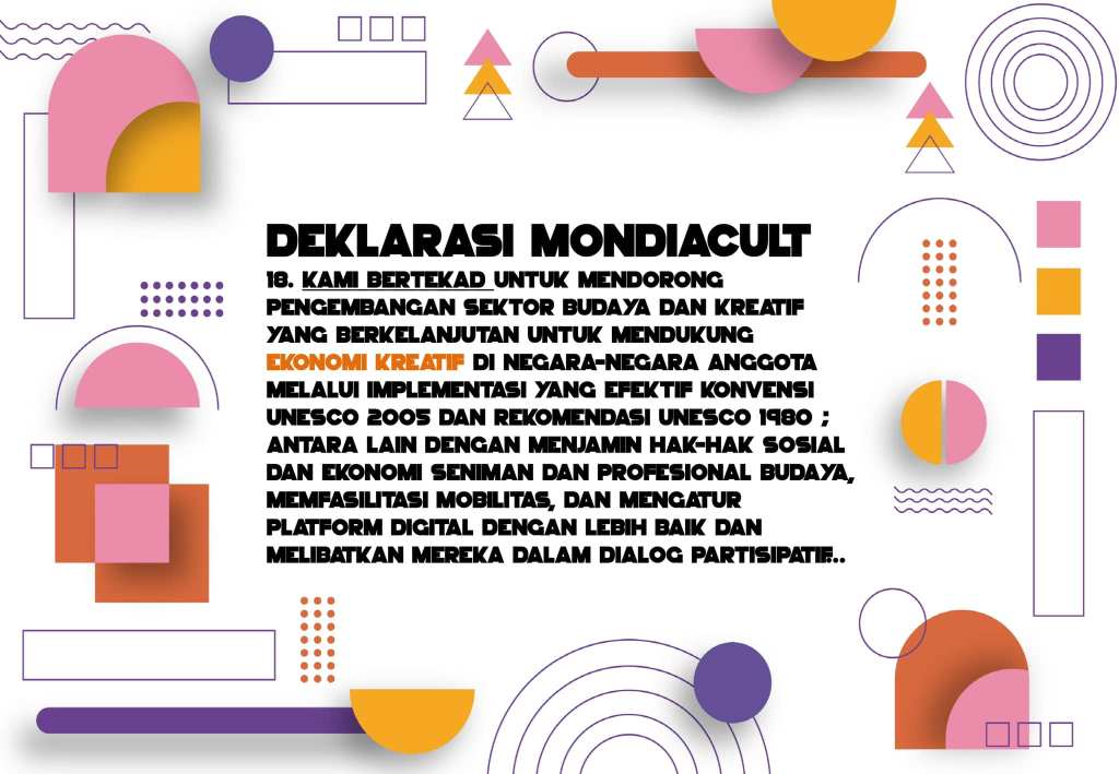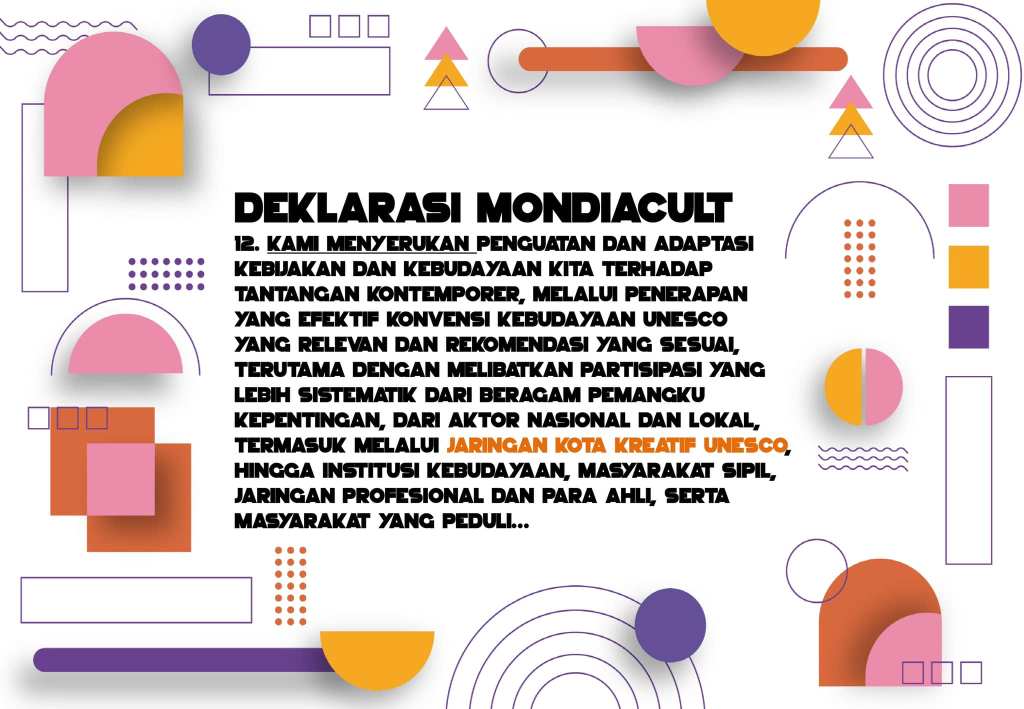 Dalam Deklarasi Mondiacult ini narasi perihal JARINGAN KOTA KREATIF UNESCO dan EKONOMI KREATIF memiliki peran sangat penting sehingga disebutkan secara jelas dalam deklarasi tersebut serta menjadi komitmen bersama.