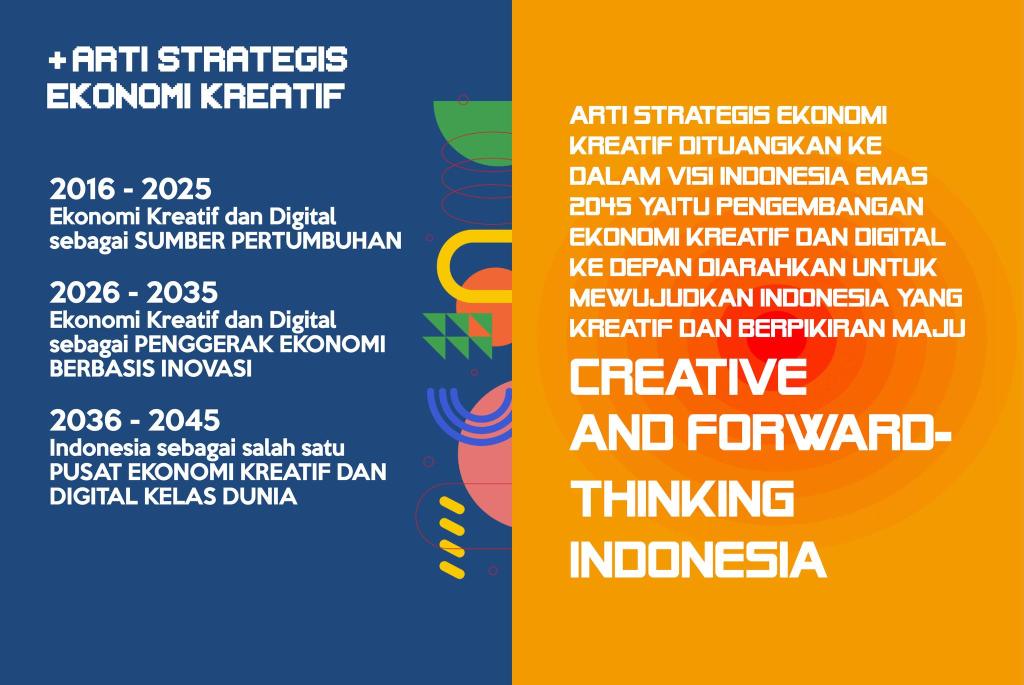 Apalagi saat ini Arti Strategis Ekonomi Kreatif dituangkan dalam Visi Indonesia Emas 2045 yaitu Pengembangan Ekonomi Kreatif dan Digital ke depan diarahkan untuk mewujudkan Indonesia Yang Kreatif dan Berpikiran Maju (Creative and Forward-Thinking Indonesia).