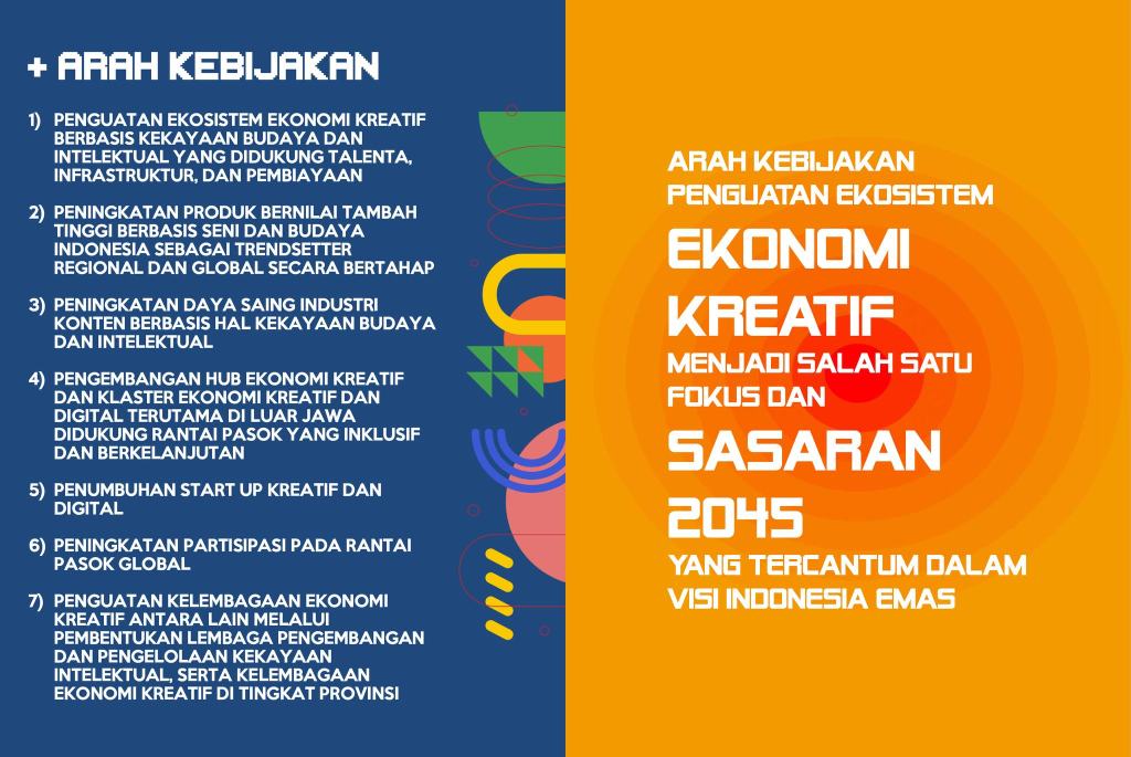 Sehingga arah kebijakan penguatan Ekosistem Ekonomi Kreatif menjadi salah satu fokus dan sasaran 2045 yang tercantum dalam Visi Indonesia Emas. Salah satunya tertulis mengenai “Penguatan Kelembagaan Ekonomi Kreatif antara lain melalui pembentukan lembaga pengembangan dan pengelolaan kekayaan intelektual, serta kelembagaan Ekonomi Kreatif di tingkat provinsi”.